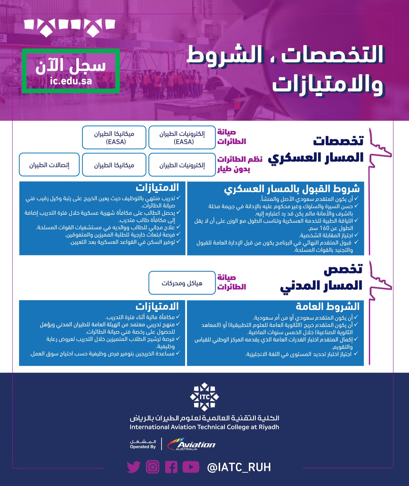 توفير السكن في القواعد العسكرية بعد التعيين للمتقدمين. 152 отметок «нравится», 163 комментариев — الكليات التقنية العالمية (@itc_ksa) в instagram: أنشئت الكلية في عام 2014م ، وتهدف الى تأهيل الكوادر السعودية للدخول في سوق عمل صناعة صيانة الطيران كفنيين محترفين وموثوقين تماشياً مع رؤية المملكة. اعلنت إدارة الكلية التقنية العالمية لعلوم الطيران عن بدأ التسجيل بالفصل الثاني في الكلية التقنية العالمية لعلوم الطيران في الرياض ،في مختلف تخصصات المسارين (العسكري والمدني)، وذلك وفقاً للتفاصيل وطريقة التسجيل الموضحة أدناه. شروط الكلية التقنية العالمية لعلوم الطيران تعرف عليها من خلال موقع برونزية، حيث يبحث الكثير من الأشخاص عن شروط التقديم في الكلية التقنية العالمية لعلوم الطيران والتي تعد واحدة من ببن الكليات السعودية الواقعة في مدينة الرياض، وتعد من الكليات الحديثة. عقدت #الكلية_التقنية_العالمية_لعلوم_الطيران بالرياض المجلس الاستشاري السابع عبر الاتصال المرئي مع نخبة من قادة منظمات صناعة الدفاع والطيران حيث تمت مناقشة سبل التعاون وبحث فرص انضمام الخريجين والاستفادة من التغذية الراجعة وإمكانية تطوير آليات. الكلية التقنية العالمية لعلوم الطيران بالرياض. الكلية التقنية العالمية للطيران تعلن بدء التسجيل في المسارين (العسكري) و(المدني). 2 تقديم الكلية التقنية العالمية لعلوم الطيران. شروط القبول في كلية التقنية العالمية. «تعلن الكليات التقنية العالمية عن فتح باب التسجيل للإلتحاق بالكليات التالية: مميزات البرنامج للعمل في الكلية التقنية العالمية لعلوم الطيران : الكلية التقنية العالمية لعلوم الطيران هي إحدى كليات التميز الحكومية التابعة للمؤسسة العامة للتدريب التقني والمهني، حيث تهدف الكلية إلى تقديم تأهيل وتدريب مميز وبأعلى المعايير العالمية في جودة التدريب التقني والمهني في مجال صيانة الطائرات، يحصل خريجوا.